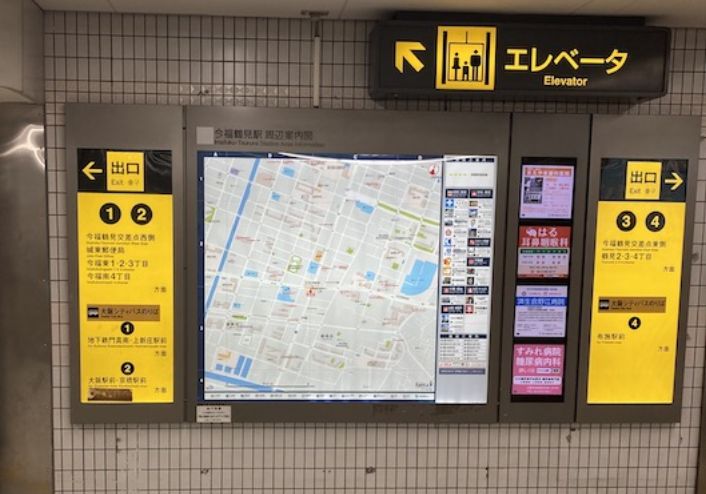 ①大阪メトロ「今福鶴見駅」で下車。改札を出て①番出口のエレベーターで地上へお上がりください