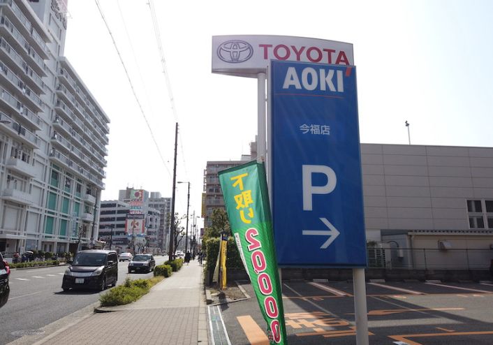 ②地上に出たら西方向へ直進してください(右側にローソンや紳士服のAOKIの看板が見えます)