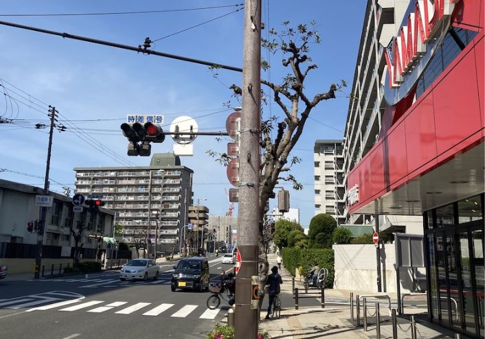 ④今福東1の交差点を右に曲がり北方向へ直進してください(右側にあるヤマダ電機が目印です)